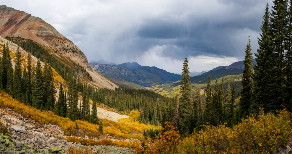 Just as I got to the top of the mountain, I turned back and saw the inclement weather changing rapidly. The alpine lake we had just stopped to see what incredible, but cold and windy as all hell! This explained that…. Anyway, I ended up hiking as fast as possible back down to the tiny lake in the center of this image where the car was parked, hoping to beat the rain!