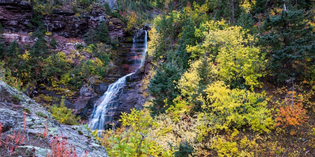 After a day full of rain, the autumn colors were really shining against the rocky mountain cliffs! The waterfall was flowing strongly through the scene and the lighting was perfect to get a balance of the different painted colors of fall. Even though this wasn’t the destination of the hike, I think it stole the show!
