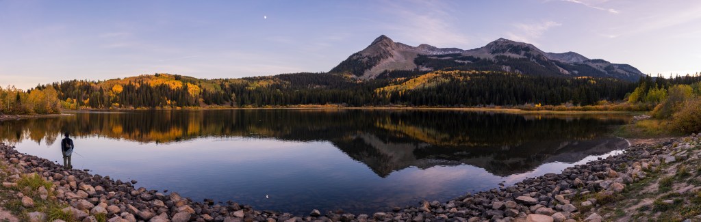 My favorite moment in the entire trip to Colorado for the fall of 2020 was this impeccably still, calm moment where a fisherman stood against the shores of an alpine lake as the moon rose overhead. The air was cool and silent, the water motionless, and the full moon rose overhead as the mountains and fall foliage glowed around us. Spectacular!